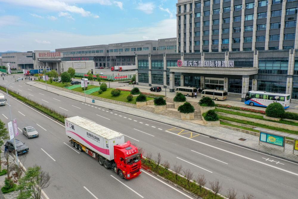 2023年10月11日,滿載筆記本電腦配件、發(fā)電機組件等產(chǎn)品的西部陸海新通道跨境公路班車從重慶南彭公路保稅物流中心駛出,途經(jīng)廣西憑祥,直達越南(無人機照片)。