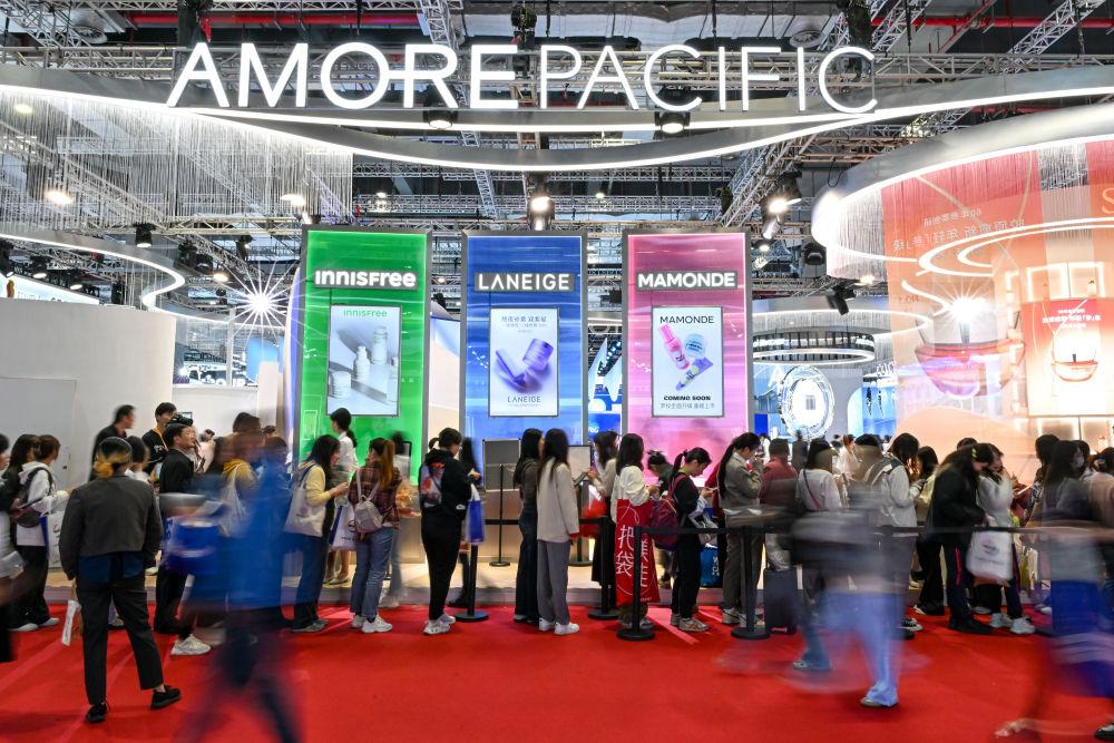 這是在上海舉行的第七屆中國國際進口博覽會消費品展區(qū)拍攝的愛茉莉太平洋展位(2024年11月7日)。韓國化妝品企業(yè)愛茉莉太平洋已連續(xù)七年參加進博會,為中國消費者提供多元化產(chǎn)品。