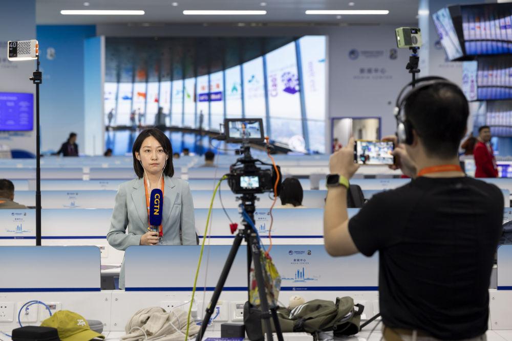 11月4日,媒體記者在第八屆進博會新聞中心媒體工作間錄制出鏡視頻。新華社記者 王翔 攝