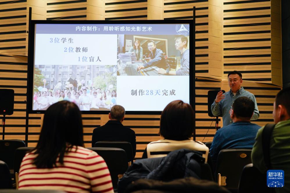 教師志愿者付海鉦在中國傳媒大學(xué)“光明影院”無障礙信息傳播實(shí)驗(yàn)室為媒體介紹光明影院項(xiàng)目(12月1日攝)。新華社記者 謝晗 攝