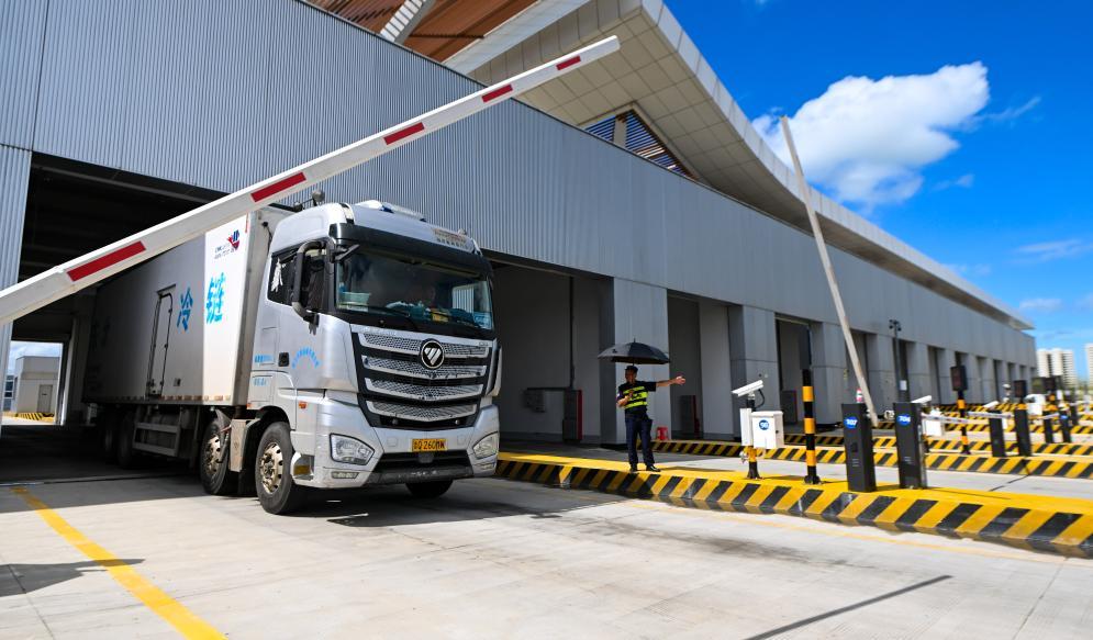 2025年9月17日,離島貨車通過??谛潞8酆湍细邸岸€口岸”(貨運)集中查驗場,開往港區(qū)。新華社記者 楊冠宇 攝