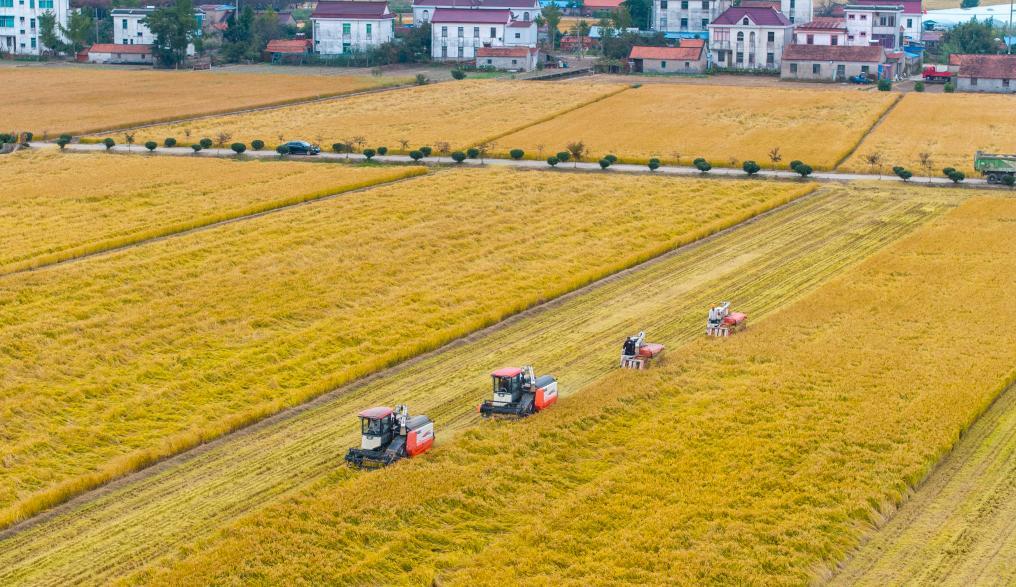 2025年10月30日,在江蘇省南通市通州區(qū)十總鎮(zhèn)育民村高標(biāo)準(zhǔn)農(nóng)田里,村民駕駛農(nóng)機(jī)收割水稻(無(wú)人機(jī)照片)。新華社發(fā)