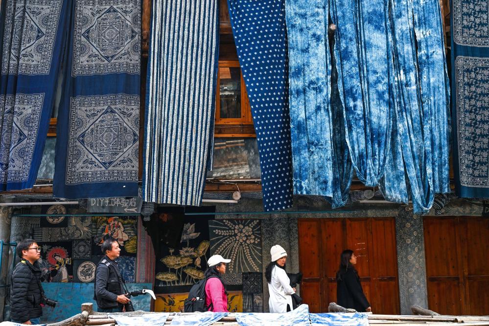年關(guān)將至,侗寨游人如織。不少游客到侗品源靛染文化體驗館,了解傳統(tǒng)非遺,體驗靛染工藝,選購民族文化商品。