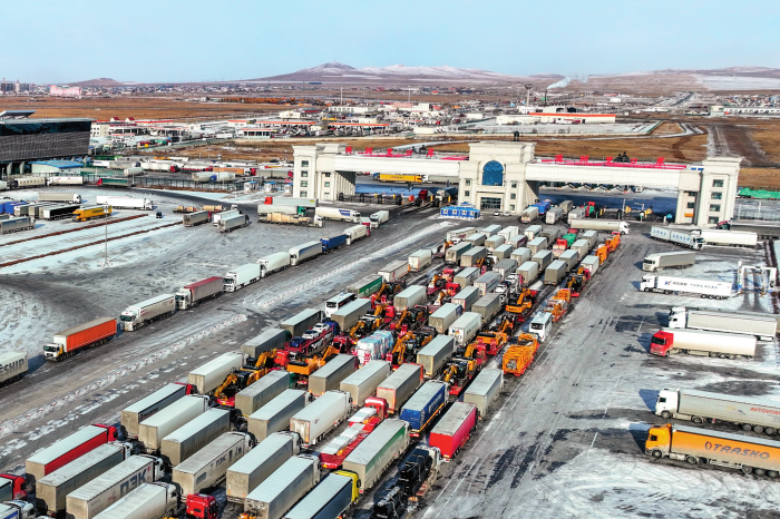 出入境貨車排隊(duì)通過滿洲里公路口岸(2025年12月3日攝)。新華社發(fā)(肖建波攝)