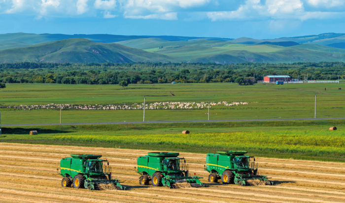 內(nèi)蒙古呼倫貝爾農(nóng)墾拉布大林農(nóng)場的工人駕駛農(nóng)機(jī)收獲小麥(2025年8月20日攝)。馬金瑞攝/本刊