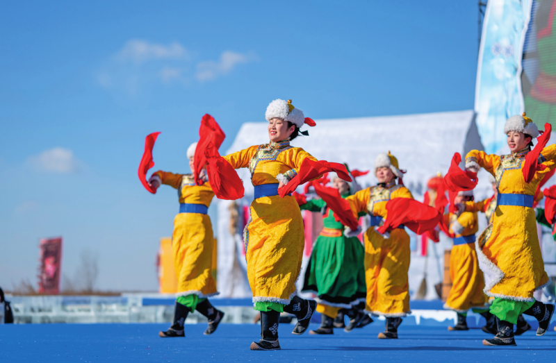 哈素海第四屆冬捕節(jié)暨冰雪旅游系列活動(dòng)在內(nèi)蒙古呼和浩特市土默特左旗開幕。這是開幕式上的文藝表演(2026年1月10日攝)。連振攝/本刊