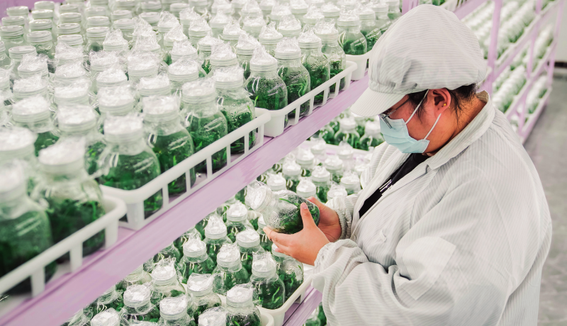 在位于吉林省公主嶺市范家屯鎮(zhèn)的恒通生態(tài)農(nóng)業(yè)科技開發(fā)有限公司,工作人員在培育室內(nèi)觀察花卉幼苗生長情況(2025年3月19日攝)。許暢攝/本刊