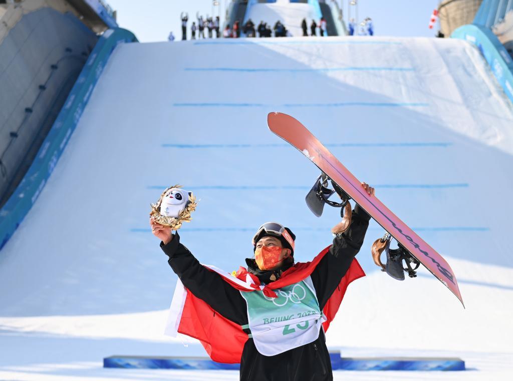 2022年2月15日,中國選手蘇翊鳴在奪得北京冬奧會(huì)單板滑雪男子大跳臺(tái)冠軍后慶祝。新華社記者 黃宗治 攝
