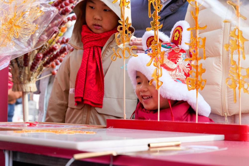 2026年2月7日,小朋友在江蘇南京舉行的“樂(lè)購(gòu)新春 蘇品蘇貨”年貨大集上觀看糖畫制作。