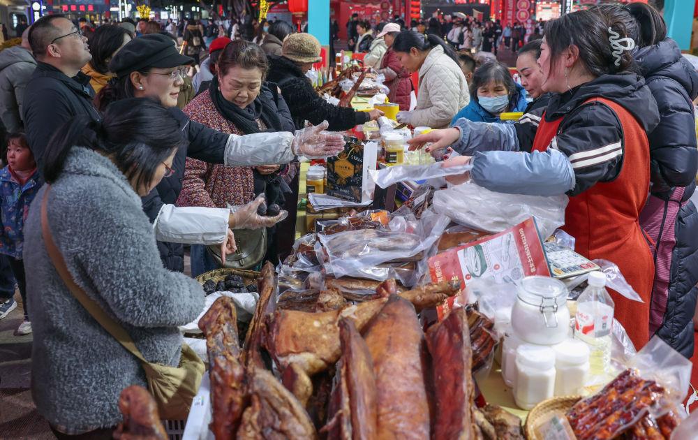 2026年2月1日,在重慶市兩江新區(qū)觀音橋步行街,市民在現(xiàn)場(chǎng)選購(gòu)巴渝“土特產(chǎn)”。當(dāng)日,巴渝“土特產(chǎn)”名優(yōu)百品年貨季在重慶啟幕。本次年貨季吸引近百家經(jīng)營(yíng)主體參展,集中展示重慶各地優(yōu)質(zhì)土特產(chǎn)。