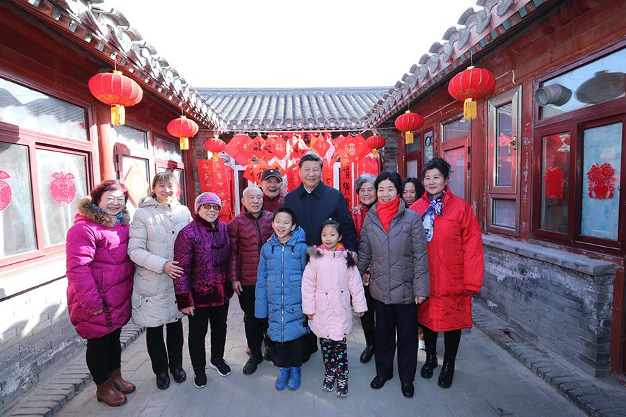 2019年2月1日上午,習(xí)近平總書記來到前門東區(qū)草廠四條胡同看望慰問群眾時(shí),同市民侯雅明一家合影。新華社記者 鞠鵬 攝