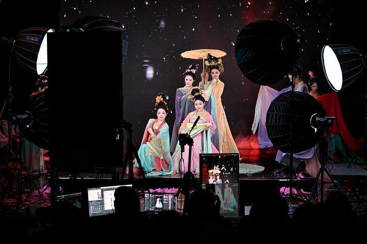 陜西省歌舞劇院的舞蹈演員在直播間進(jìn)行“團(tuán)播”表演(2025年12月25日攝)。“團(tuán)播”這一多人演藝直播新形式,正成為專業(yè)文藝院團(tuán)開辟線上“第二舞臺(tái)”、推動(dòng)傳統(tǒng)文化創(chuàng)新表達(dá)的新嘗試?!柏Q屏化”“快節(jié)奏”的改編,讓傳統(tǒng)劇目受到越來越多年輕人喜愛。數(shù)據(jù)顯示,陜西省歌舞劇院“團(tuán)播”單場(chǎng)最高曝光量超500萬,帶動(dòng)線下票房增長(zhǎng)約10%。