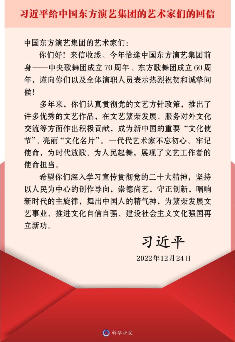 2022年,習(xí)近平總書記給中國(guó)東方演藝集團(tuán)的藝術(shù)家們回信,勉勵(lì)他們?yōu)榻ㄔO(shè)社會(huì)主義文化強(qiáng)國(guó)再立新功。