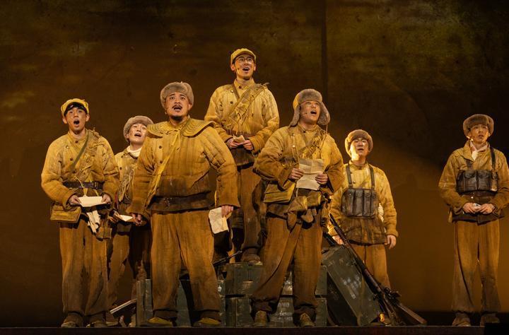 這是音樂劇《尋找李二狗》的演出劇照(2025年4月7日攝)。該劇以抗美援朝偉大歷史為背景,取材自志愿軍第39軍116師真實(shí)故事,通過當(dāng)代青年常衛(wèi)國(guó)借助爺爺?shù)幕貞涗洿┰交?950年鴨綠江畔的舞臺(tái)設(shè)定,展開兩代青年的跨時(shí)空對(duì)話。2025年11月,該劇榮獲第十八屆文華劇目獎(jiǎng)。