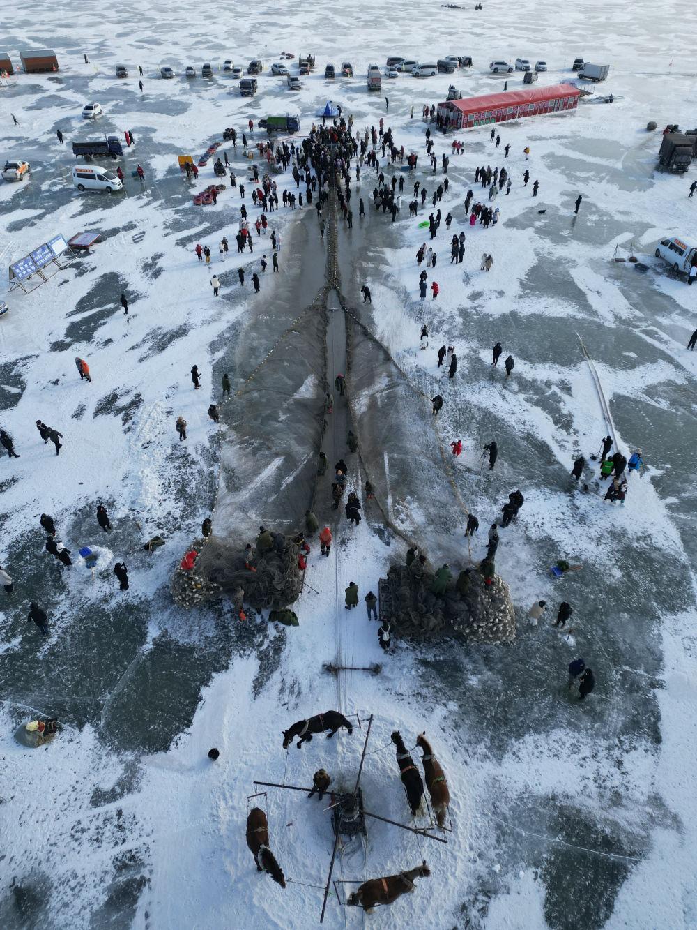在吉林省松原市,游客在查干湖冰面上觀看冬捕(2026年1月7日攝,無人機照片)。新華社記者 顏麟蘊 攝