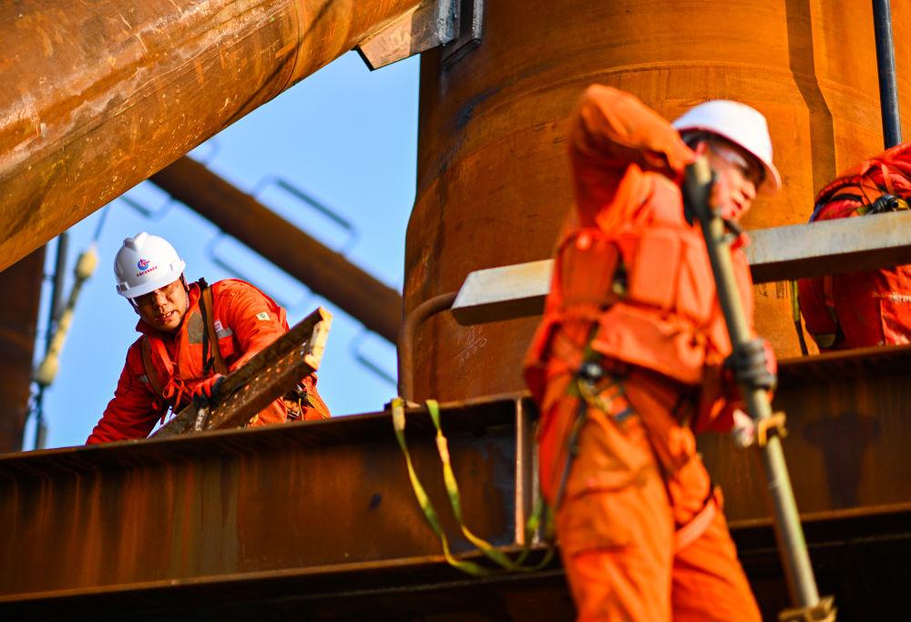 2026年2月13日,工人在位于渤海中部海域的渤中26-6油田開發(fā)項(xiàng)目(二期)作業(yè)現(xiàn)場(chǎng)施工。新華社記者 趙子碩 攝