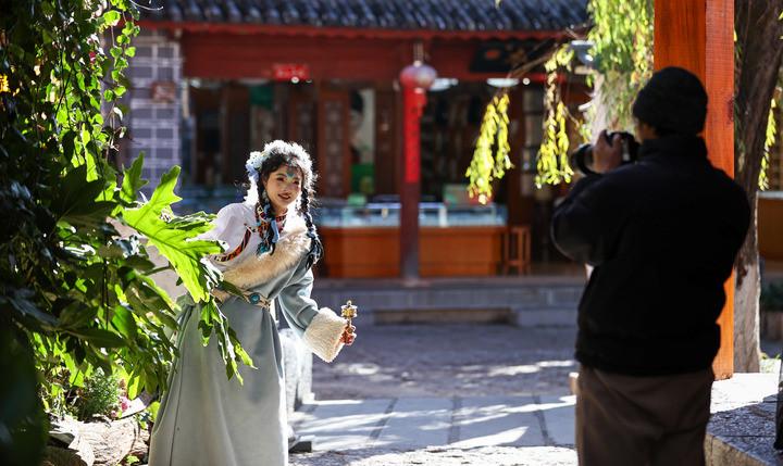 2026年1月13日,游客在麗江古城體驗旅拍。新華社記者 江文耀 攝