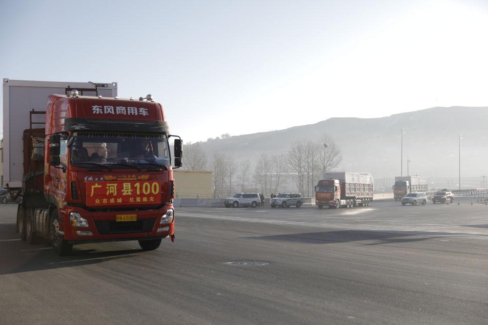 2023年12月26日,在甘肅省臨夏州積石山高速出口,載著活動(dòng)板房的貨車駛向受災(zāi)鄉(xiāng)鎮(zhèn)。新華社記者 方欣 攝
