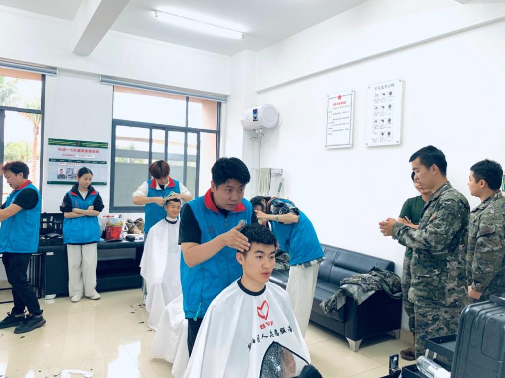 3月4日,北京“梵珀匠人志愿服務(wù)隊(duì)”和海南省技師學(xué)院師生開(kāi)展義務(wù)理發(fā)志愿服務(wù)。(受訪者供圖)