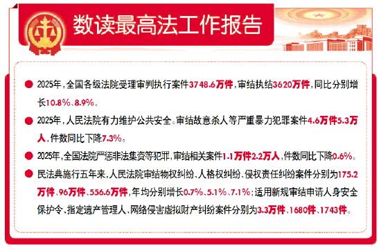 報告著重強調(diào)“恪守公平正義”,圍繞“保障高水平安全”“服務(wù)高質(zhì)量發(fā)展”“守護(hù)高品質(zhì)生活”“助力高水平開放”等方面,回顧了2025年人民法院各項工作。