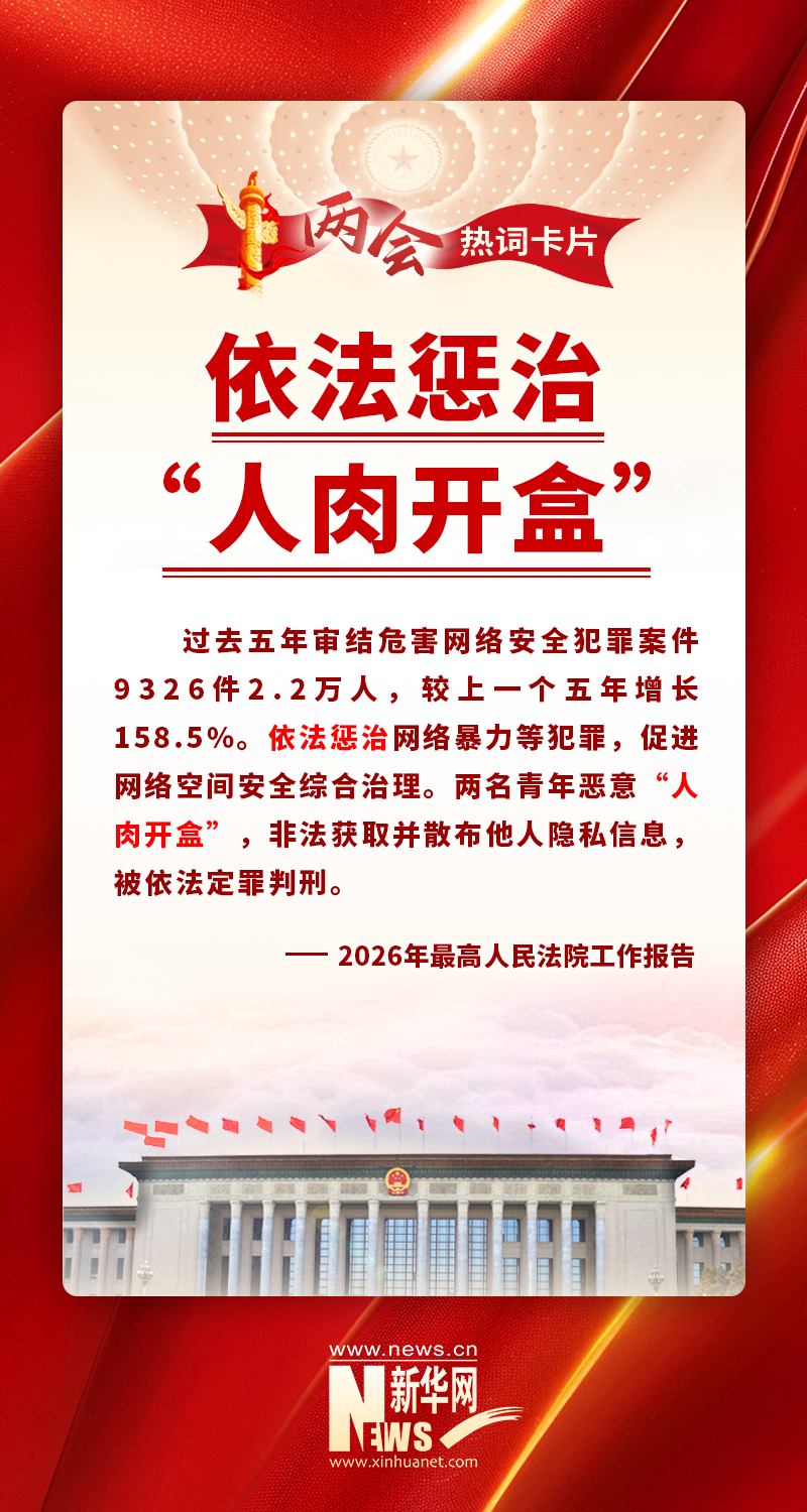 最高人民法院辦公廳副主任海偉:當(dāng)前新型犯罪案件數(shù)量增長較快,比如,過去五年法院審結(jié)的危害網(wǎng)絡(luò)安全犯罪案件,較上一個(gè)五年增長158.5%。繼2024年、2025年報(bào)告強(qiáng)調(diào)懲治“按鍵傷人”“按鍵殺人”行為后,今年報(bào)告又特別提到懲治“人肉開盒”這種新型網(wǎng)絡(luò)暴力犯罪,就是警示網(wǎng)絡(luò)空間決不是法外之地。