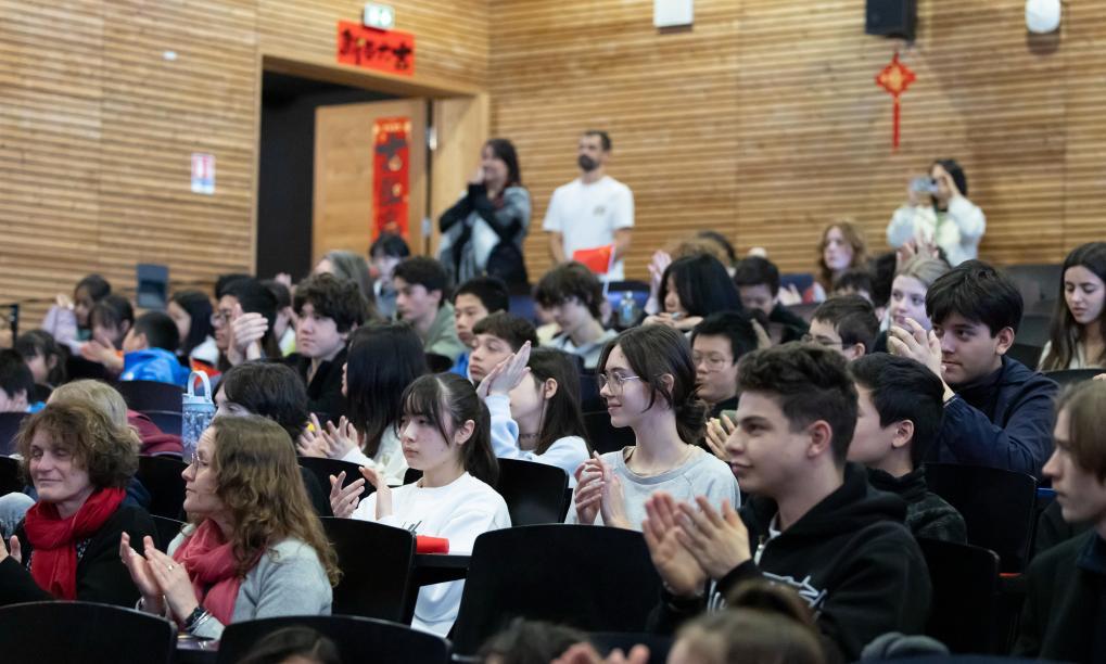 當(dāng)?shù)貢r(shí)間3月12日,普羅旺斯小城馬諾斯克,春日和煦。學(xué)校的階梯教室里,紅燈籠和中國(guó)結(jié)高高掛起,中國(guó)駐馬賽總領(lǐng)館向?qū)W校轉(zhuǎn)交習(xí)近平主席復(fù)信,現(xiàn)場(chǎng)氣氛熱烈,在座師生們鼓掌、歡呼,臉上洋溢著興奮的笑容。