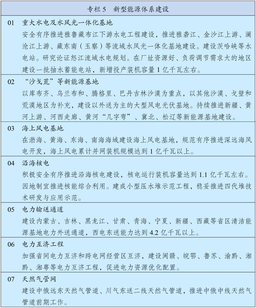 堅(jiān)持立足國(guó)內(nèi)、補(bǔ)齊短板、多元保障、強(qiáng)化儲(chǔ)備,加強(qiáng)能源產(chǎn)供儲(chǔ)銷(xiāo)體系建設(shè)。堅(jiān)持油氣核心需求自主保障,實(shí)施中長(zhǎng)期油氣增儲(chǔ)上產(chǎn)戰(zhàn)略行動(dòng),確保原油年產(chǎn)量穩(wěn)定在2億噸左右、天然氣產(chǎn)量穩(wěn)步增長(zhǎng),加強(qiáng)煤制油氣產(chǎn)能和技術(shù)儲(chǔ)備。強(qiáng)化政府儲(chǔ)備和企業(yè)儲(chǔ)備協(xié)同,提升國(guó)家石油儲(chǔ)備規(guī)模,建立更加靈活的輪換動(dòng)用機(jī)制,增強(qiáng)天然氣儲(chǔ)備調(diào)節(jié)保障能力,完善煤炭?jī)?chǔ)備體系。健全能源保供中長(zhǎng)期合同制度,完善電力應(yīng)急調(diào)度機(jī)制和備用電源配置,強(qiáng)化能源需求側(cè)管理。加強(qiáng)戰(zhàn)略性礦產(chǎn)資源勘探開(kāi)發(fā)和儲(chǔ)備,深入實(shí)施新一輪找礦突破戰(zhàn)略行動(dòng),統(tǒng)籌加強(qiáng)產(chǎn)品、產(chǎn)能和產(chǎn)地儲(chǔ)備,推動(dòng)大宗商品儲(chǔ)運(yùn)基地建設(shè),提升戰(zhàn)略性礦產(chǎn)資源安全風(fēng)險(xiǎn)監(jiān)測(cè)預(yù)警和應(yīng)急保供水平。加強(qiáng)能源資源開(kāi)發(fā)國(guó)際合作,維護(hù)戰(zhàn)略通道安全。