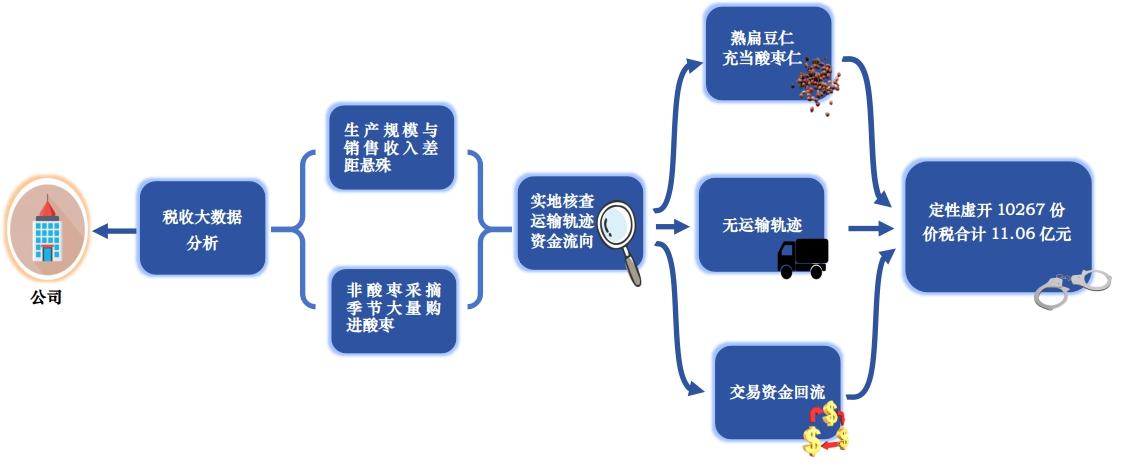 檢查人員隨即調(diào)取了8戶企業(yè)的稅費申報數(shù)據(jù)和進銷項發(fā)票的開具情況,進一步了解企業(yè)的生產(chǎn)經(jīng)營模式。經(jīng)核實,8戶企業(yè)均是購進酸棗去除果肉進行破殼,產(chǎn)出酸棗仁后對外銷售。但上述8戶企業(yè)只有對外銷售酸棗仁時才突擊采購酸棗,甚至在1-2月非酸棗采摘季節(jié)大量購進酸棗,農(nóng)產(chǎn)品收購票清一色“頂額連號”,這明顯不合理。