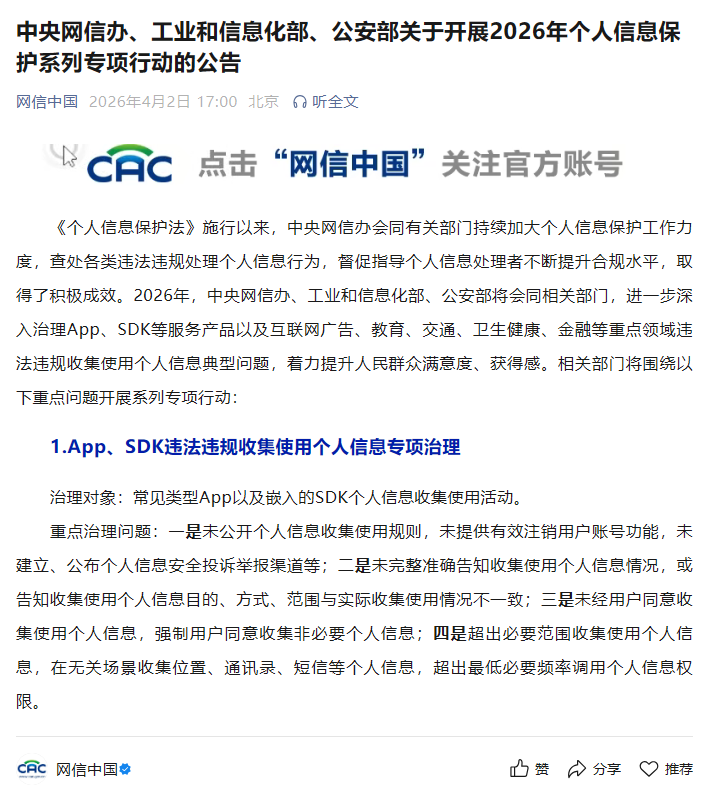 《個人信息保護(hù)法》施行以來,中央網(wǎng)信辦會同有關(guān)部門持續(xù)加大個人信息保護(hù)工作力度,查處各類違法違規(guī)處理個人信息行為,督促指導(dǎo)個人信息處理者不斷提升合規(guī)水平,取得了積極成效。2026年,中央網(wǎng)信辦、工業(yè)和信息化部、公安部將會同相關(guān)部門,進(jìn)一步深入治理App、SDK等服務(wù)產(chǎn)品以及互聯(lián)網(wǎng)廣告、教育、交通、衛(wèi)生健康、金融等重點領(lǐng)域違法違規(guī)收集使用個人信息典型問題,著力提升人民群眾滿意度、獲得感。相關(guān)部門將圍繞以下重點問題開展系列專項行動: