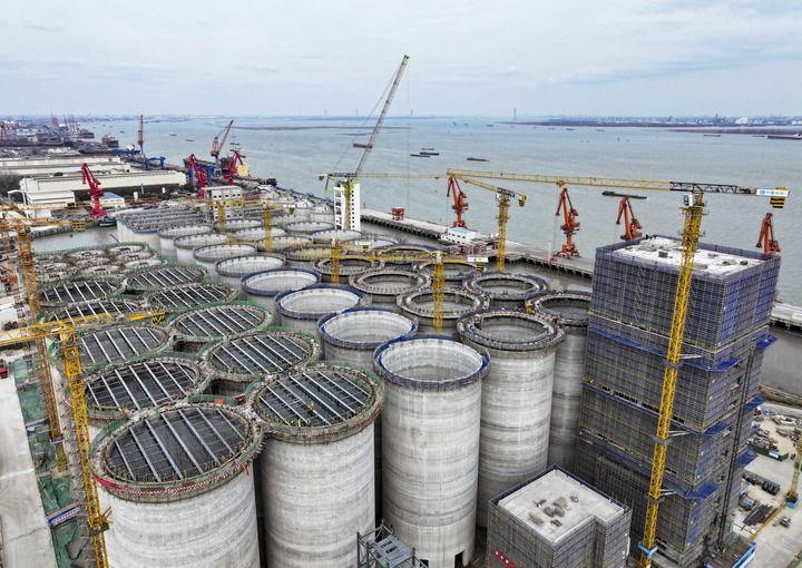 在江蘇省靖江市拍攝的中糧靖江碼頭倉儲物流項目建設現場(2025年2月20日攝,無人機照片)。新華社發(fā)(顧繼紅攝)