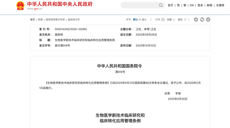 我國(guó)首部專門規(guī)范生物醫(yī)學(xué)新技術(shù)臨床研究的行政法規(guī)《生物醫(yī)學(xué)新技術(shù)臨床研究和臨床轉(zhuǎn)化應(yīng)用管理?xiàng)l例》(國(guó)務(wù)院令第818號(hào),簡(jiǎn)稱“818號(hào)令”)(以下簡(jiǎn)稱《條例》)將于2026年5月1日正式施行。新規(guī)明確禁止在臨床研究階段以任何形式向受試者收取費(fèi)用,并首次將醫(yī)療機(jī)構(gòu)及醫(yī)務(wù)人員列為直接責(zé)任主體,標(biāo)志著干細(xì)胞、免疫細(xì)胞等前沿療法告別“灰色操作”,全面進(jìn)入依法監(jiān)管新階段。