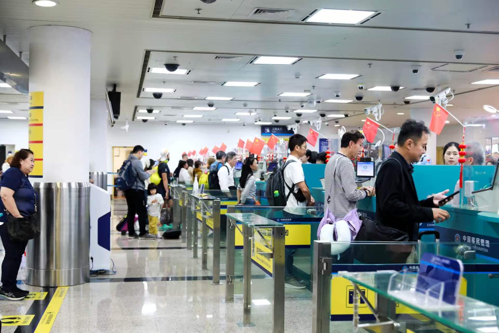 圖為高崎國(guó)際機(jī)場(chǎng),高崎邊檢站移民管理警察正在進(jìn)行旅客驗(yàn)放 馬聞?shì)?攝
