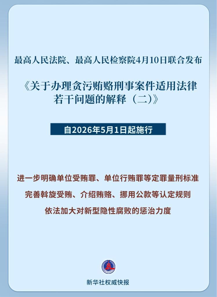最高人民法院、最高人民檢察院4月10日聯(lián)合發(fā)布《關(guān)于辦理貪污賄賂刑事案件適用法律若干問(wèn)題的解釋(二)》,自2026年5月1日起施行。