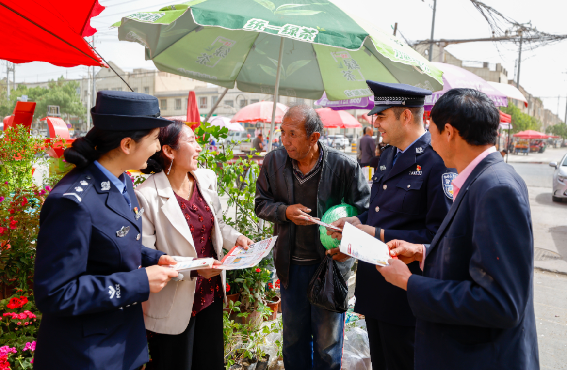 4月12日,新疆維吾爾自治區(qū)葉城縣依提木孔鎮(zhèn)派出所民輔警借助每周的趕集日,在集市設起“法治小攤”、擺放宣傳展板、備好宣傳手冊,以接地氣的方式將法律知識送到群眾身邊。