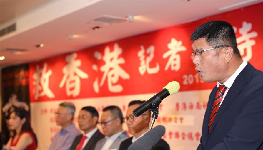 8月15日,香港福建社團聯會副主席蔡建四在會上宣讀這些社團發(fā)表的聯署聲明《反暴力 救香港》。 新華社記者 吳曉初 攝