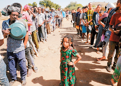 十一月二十八日,在蘇丹靠近埃塞俄比亞的邊境地帶,從提格雷州逃離的埃塞俄比亞難民排隊(duì)等待領(lǐng)取食物。新華社/路透