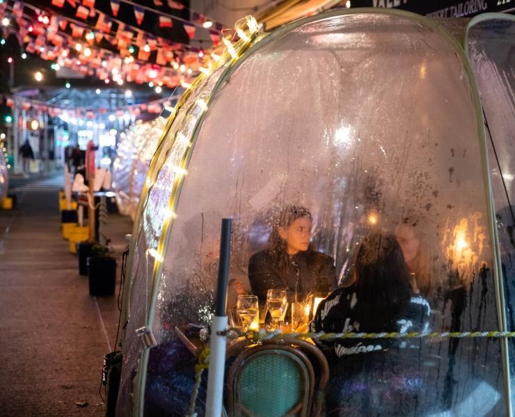 12月14日,在美國紐約,人們在一家餐廳的室外就餐區(qū)就餐。