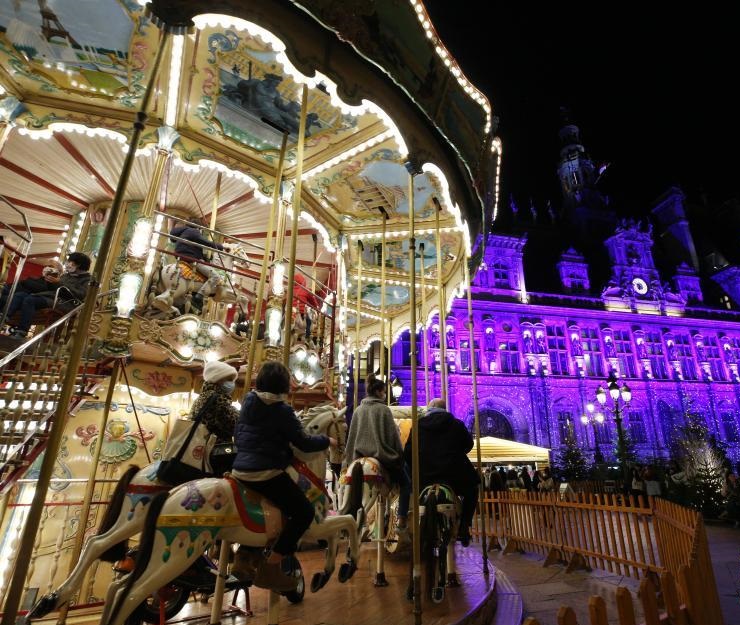 12月15日,在法國巴黎市政廳廣場(chǎng),人們?cè)谙俺俗D(zhuǎn)木馬。為迎接即將到來的圣誕和新年,市政廳廣場(chǎng)設(shè)置圣誕裝飾和旋轉(zhuǎn)木馬。