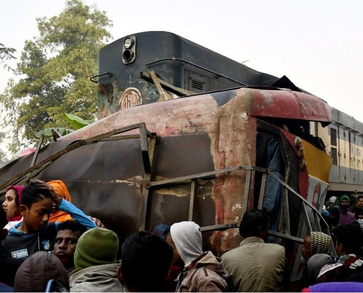 12月19日,人們聚集在孟加拉國西北部焦伊布爾哈德地區(qū)的火車與客車相撞事故現(xiàn)場。
