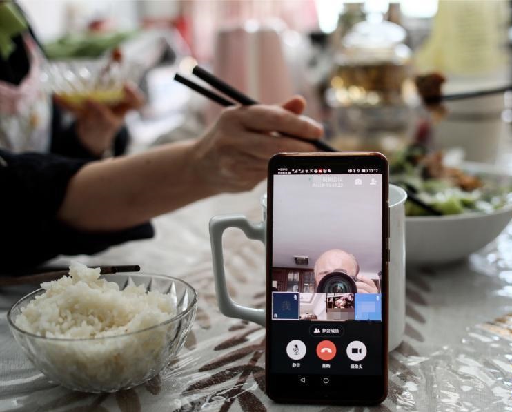 2月17日,一名攝影記者在北京的家中參加線上會(huì)議時(shí)拍攝參會(huì)使用的手機(jī)。新冠疫情暴發(fā)以來,居家辦公、線上會(huì)議成為工作“新常態(tài)”。