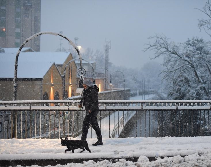 12月28日,在意大利北部城市米蘭,一名女子在雪中遛狗。當日,米蘭迎來降雪天氣。新華社發(fā)(達尼埃萊·馬斯科洛攝)