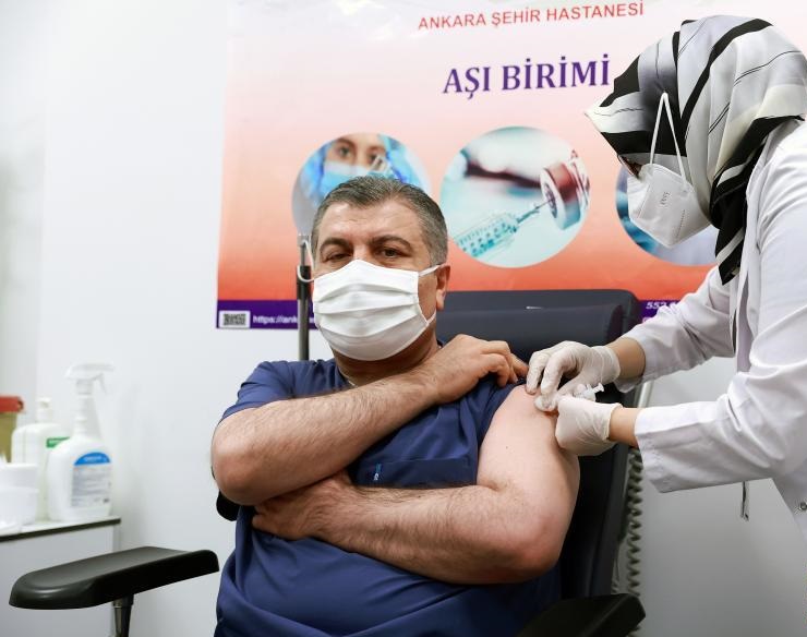 1月13日,土耳其衛(wèi)生部長(zhǎng)科賈(左)在安卡拉接種中國(guó)新冠疫苗。土耳其衛(wèi)生部長(zhǎng)科賈13日接種中國(guó)科興公司研發(fā)的新冠疫苗,并向民眾進(jìn)行了現(xiàn)場(chǎng)電視直播。同時(shí)接種中國(guó)疫苗的還有土耳其應(yīng)對(duì)新冠疫情科學(xué)委員會(huì)成員。(新華社發(fā))