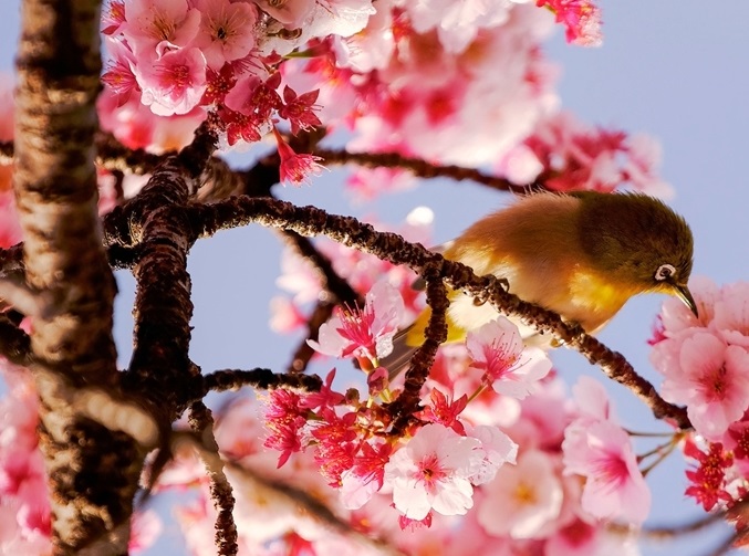 當(dāng)?shù)貢r間2月17日,日本東京,早春的氣息漸濃,櫻花盛開,鳥兒在枝頭嬉戲。(圖片來源:東方IC)