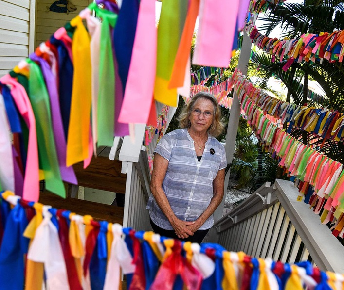 人民網(wǎng)訊 據(jù)媒體3月10日?qǐng)?bào)道,美國(guó)佛羅里達(dá)州安娜瑪麗亞島,67歲的凱西·托拜厄斯(Cathy Tobias)在院子里系上絲帶,紀(jì)念新冠肺炎遇難者?,F(xiàn)在她的院子里有超過(guò)3萬(wàn)條絲帶,從露臺(tái)、樓梯到陽(yáng)臺(tái)都系滿(mǎn)了五顏六色的帶子,每一條代表著一位死于新冠肺炎的佛州人。