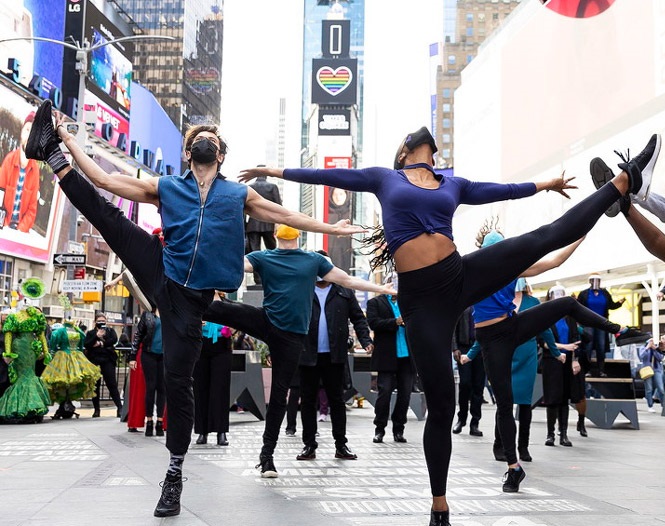 人民網(wǎng)訊 當(dāng)?shù)貢r(shí)間2021年3月12日,美國紐約,百老匯劇院關(guān)閉一周年,美國戲劇界在時(shí)代廣場組織了一場名為“我們會回來的”的快閃演出。