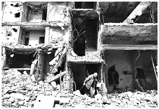 圖② 當?shù)貢r間3月11日,敘利亞霍姆斯老人哈迪·古松走在被炸毀的建筑里。 新華社發(fā)