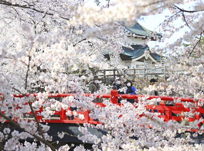 當?shù)貢r間4月19日,日本青森弘前市,弘前公園里櫻花盛放,吸引游客賞花。(圖片來源:東方IC)