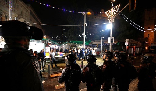 5月9日,以色列警察在耶路撒冷老城大馬士革門附近警戒。4月13日以來,巴以雙方?jīng)_突事件持續(xù)發(fā)生,造成人員死傷,緊張局勢加劇。新華社發(fā)(穆阿邁爾·阿瓦德 攝)
