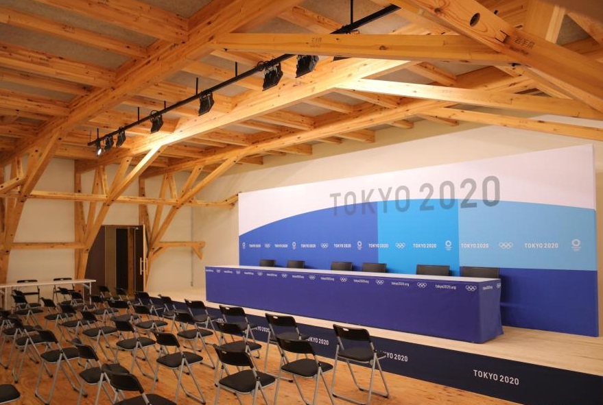 這是6月20日在東京奧運(yùn)會(huì)奧運(yùn)村內(nèi)拍攝的新聞發(fā)布廳。