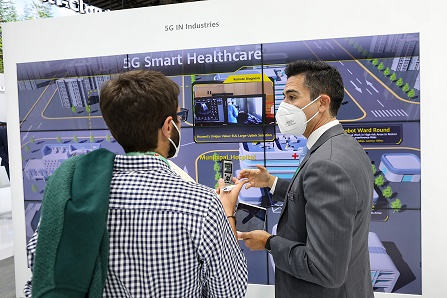 6月28日,在西班牙巴塞羅那,工作人員(右)在世界移動通信大會華為展廳介紹5G技術與智慧醫(yī)療。